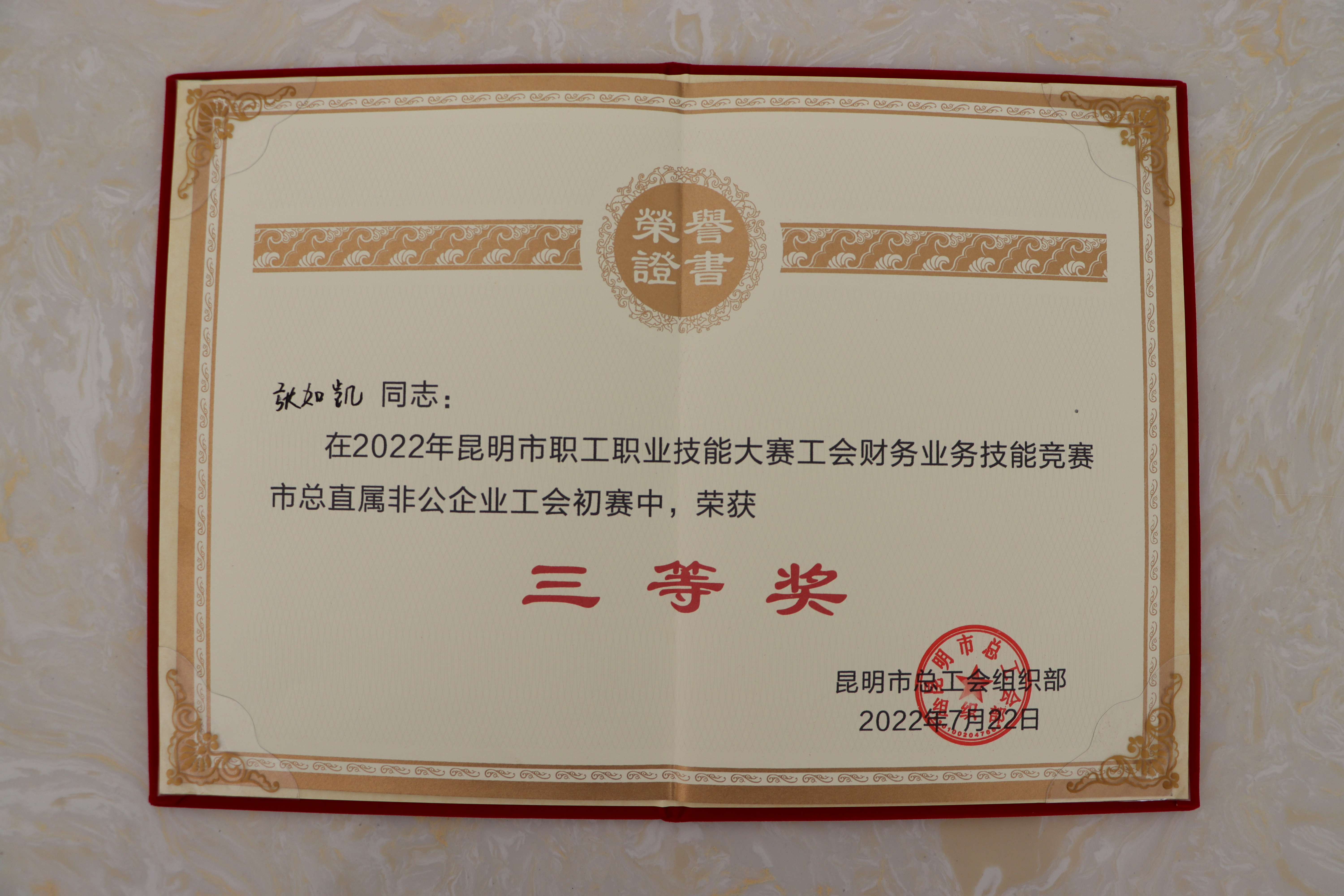 2022年7月22日下午,昆明市高速公路建設(shè)開發(fā)股份有限公司下屬昆明東南繞城高速公路開發(fā)有限公司張如凱同志代表公司參加昆明市總工會舉辦的“喜迎二十大 建功新時代 當(dāng)好排頭兵”職工職業(yè)技能大賽工會財務(wù)業(yè)務(wù)技能競賽初賽,榮獲“三等獎”。