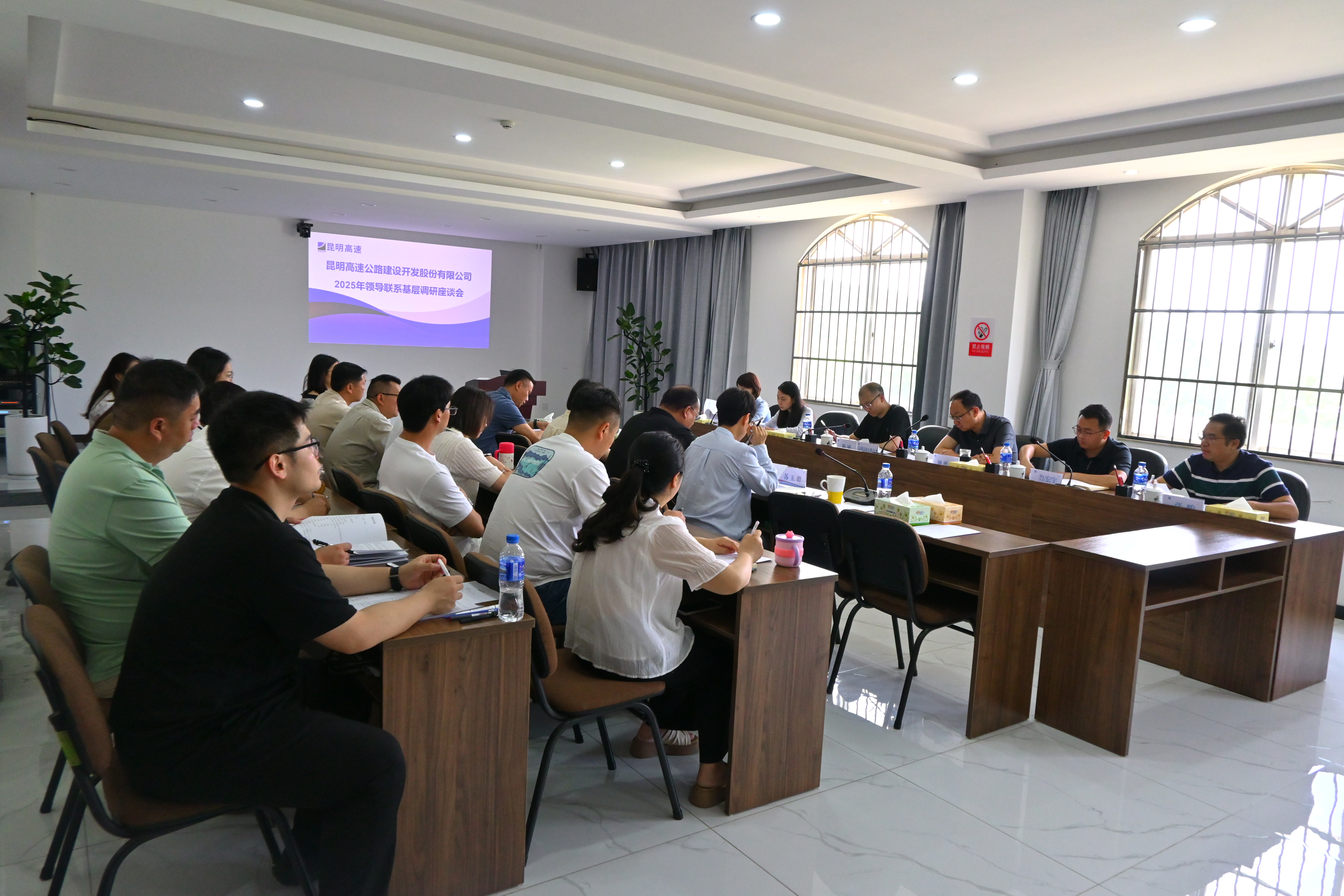昆明高速公路公司綜合部、人力資源部、公路運(yùn)營部、安全生產(chǎn)部有關(guān)負(fù)責(zé)人,以及四家公司領(lǐng)導(dǎo)班子及各部門負(fù)責(zé)人參加了本次調(diào)研座談會(huì)。