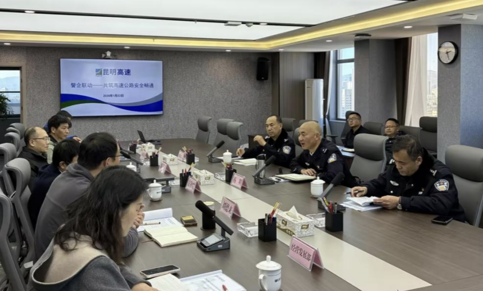 2026年1月22日,昆明高速公路公司主持召開了“警企聯(lián)動—共筑高速公路安全暢通”交流座談會。會議特邀昆明市公安局交通管理支隊支隊長楊明一行出席。昆明高速公路公司黨委書記、董事長袁和耀,黨委委員、總經(jīng)理陳鋮,黨委委員、副總經(jīng)理劉德來及相關部門負責人,下屬公司(內(nèi)、外環(huán)高速公路)負責人參加會議。